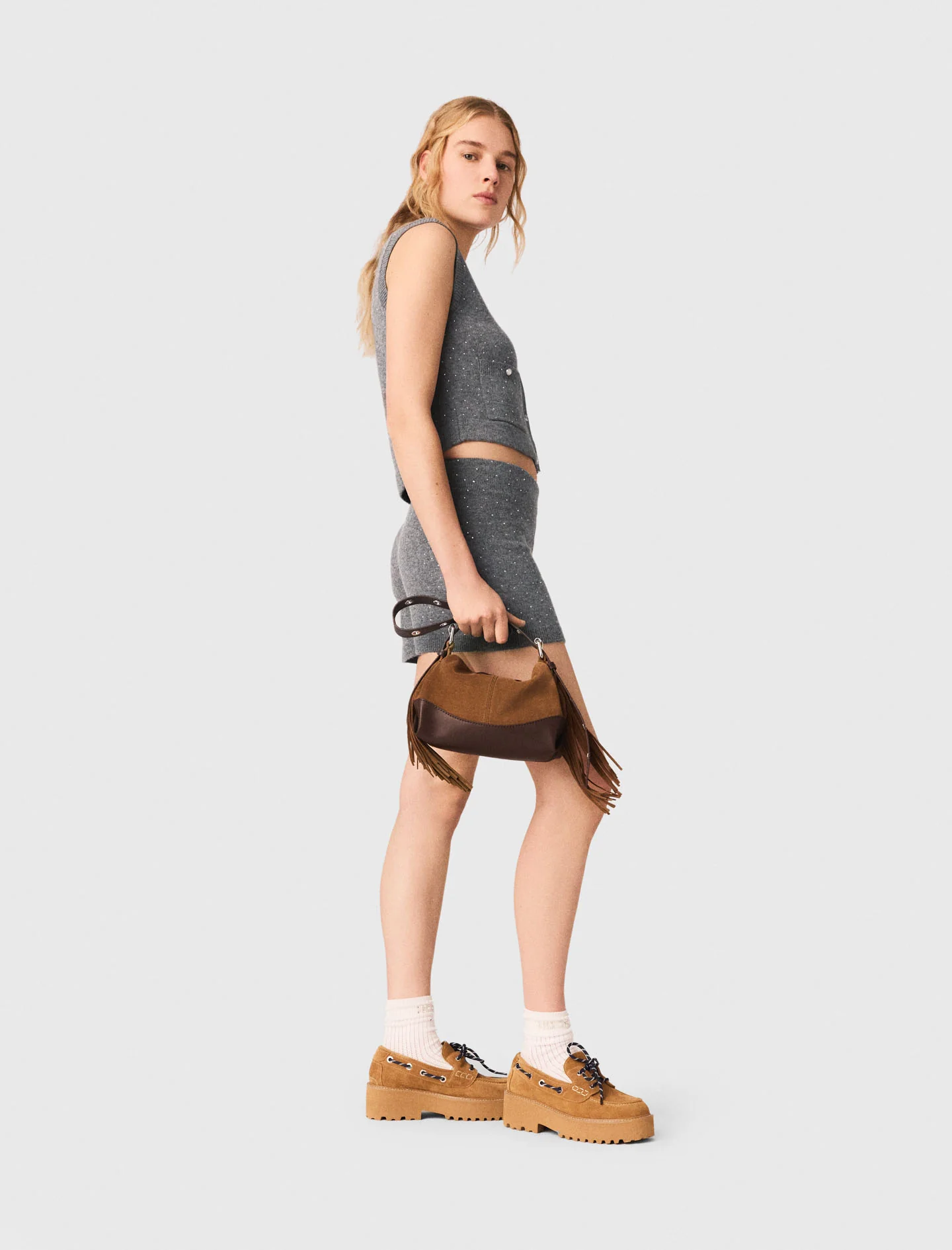 For a complete look, pair it with the matching shorts and complete the outfit with platform boat shoes and a Miss M bag.